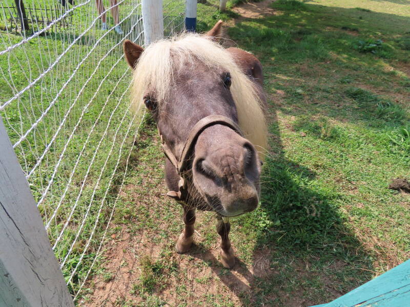 Other residents are not known for their racing careers. Popcorn Deelites (who at the time of my tour is wearing a fly mask) was one of about eight horses who played Seabiscuit in the 2004 biopic starring Tobey McGuire. Little Silver Charm is a miniature horse who you see before Silver Charm, and you can’t help but be won over by the joke. Blowen bought a trailer for $40, and when he received it, Little Silver Charm came off it along with some goats and ducks.