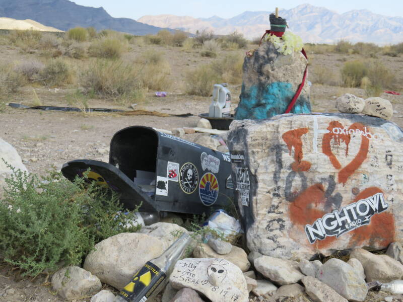 Soon I come upon what appears to be a transient campsite for UFO-hunters, alien fanatics, and wayward travelers. It contains rocks (many decorated by paint or etchings), a mannequin head, an American flag, a cover-less lawn chair, and trash. A bottle of “RADIOACTIVE SODA,” a real soda that is mulberry-flavored and has a radiation symbol on the label, is propped up against a rock.
