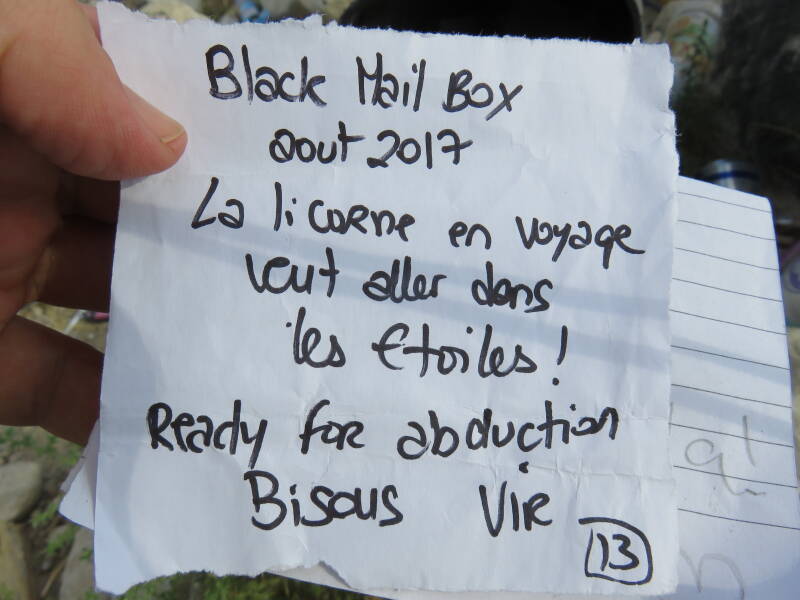 A large black mailbox, lid open, stuffed with letters and covered in stickers, begs my attention. Ordinary people have addressed the aliens. One tells of her husband’s fascination with aliens and UFOs. He died four years ago and “would have loved to meet an alien in person.” Another, written on a religious pamphlet, reads “Je viens en pair” (French for “We come in peace”).