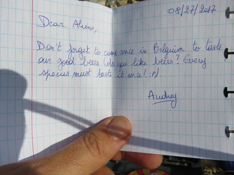 “Dear Aliens, Don’t forget to come once to Belgium to taste our good beers (do you like beers? Every species must taste it once!).”