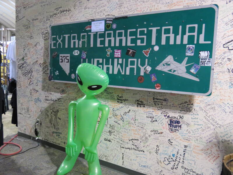 Hundreds of dollar bills hang from the ceiling, most written on: “Beam us up, Scotty”; “Falcons and Patriots Superbowl was rigged”; “The Truth is out there”; and “I want to believe” for example. Hats, shirts, socks, and alien-grafted liquor bottles are for sale; posters, paintings, signage, and photographs cover up the walls. An alien model, dressed in a purple robe, peers out a window.