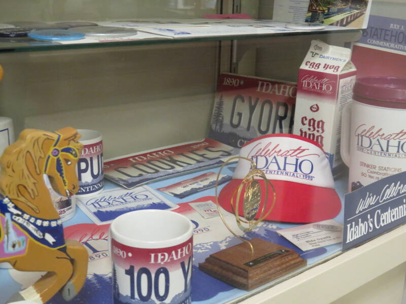 Their Idaho Centennial collection includes hats, mugs, a commemorative plate, and a gold-plated rifle (one of 100 produced). Jim himself participated in the celebrations, building floats.