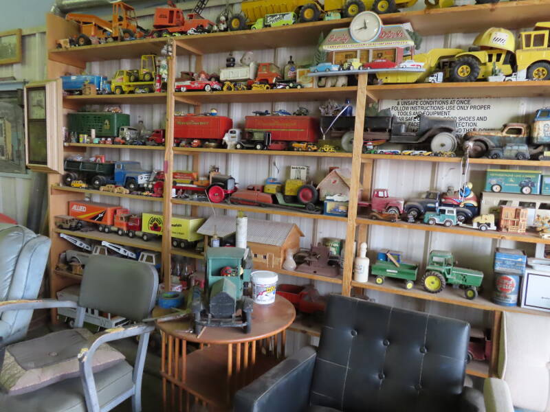 Lewis and his partner Beth each have an armchair set up in the front of the garage, along with an old barber chair, a ratty couch, piles of magazines, a gumball machine, and dusty shelving. In fact, it’s hard to comprehend you are walking into a museum at all. A plastic container like the kind restaurants use as tip jars is there for the modest $5 admission fee.