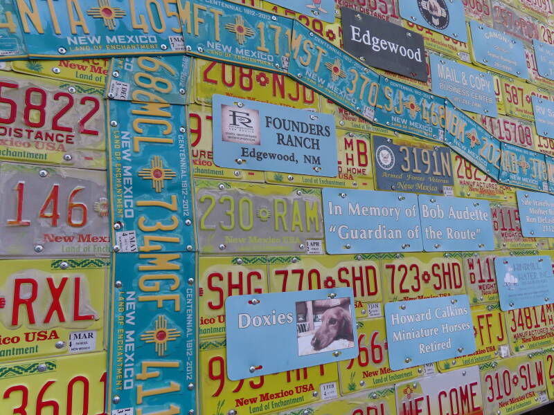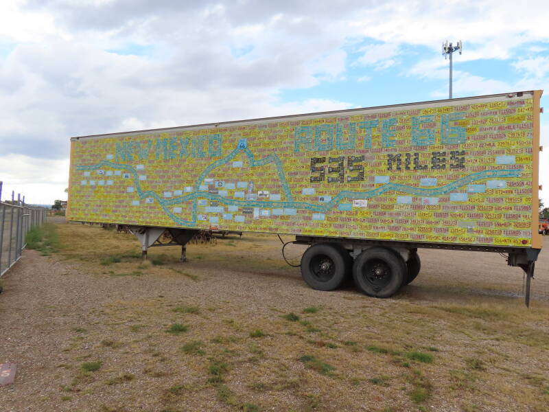 Moriarty sits on Route 66, and the License Plate Memorial Wall inhabits the museum’s grounds. A group of enthusiasts called “RETRO 66” constructed the mural several years ago. They plastered a semi-trailer with New Mexico license plates in colors arranged to spell out “NEW MEXICO,” “ROUTE 66,” and “535 MILES” (the latter figure indicating what is the longest stretch of Route 66 in the country, according to the group’s president at the time). A ribbon of road in turquoise plates underlies the letters. On the other side of the trailer, viewers take in various road signs, as well as more license plates which snake from one end to the other and include most of the Route 66 states.