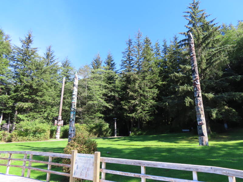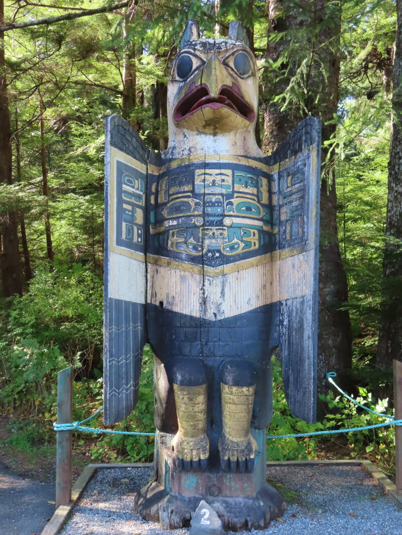 Tucked away off a highway near Ketchikan, Alaska, is Totem Bight State Historical Park. It is home to totem poles and a clan house representative of those from the Tlingit and Haida Native Alaskan tribes. On my visit, there are no park rangers present, but there is a pamphlet and signage to allow for a self-guided tour.