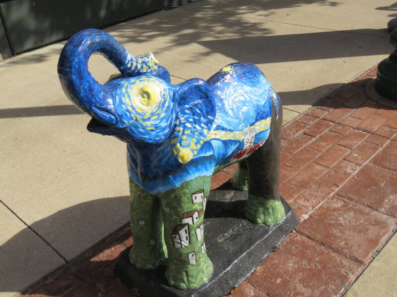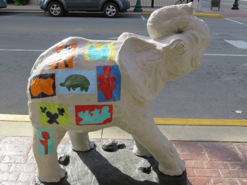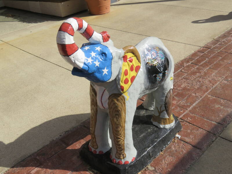 In Wabash, Indiana, a series of painted elephant statues pay homage to Modoc the elephant, who in 1942 escaped along with two other pachyderms from the Great American Circus. The circus had docked in Wabash for a performance. Dogs spooked the elephants, but while the other two were shortly recovered, Modoc smelled fresh roasted peanuts from the Bradley Brothers Drug Store. She crashed through the front door, helped herself, then led trainers on a chase across a river and into the farming communities of the neighboring county before finally being lured into a trailer. The statues can be found in front of the site of the store, which today is occupied by Modoc’s Market. A plaque references the event, recounting “Her antics hit headlines across the country, making Modoc the most famous elephant in America for one week in 1942.”