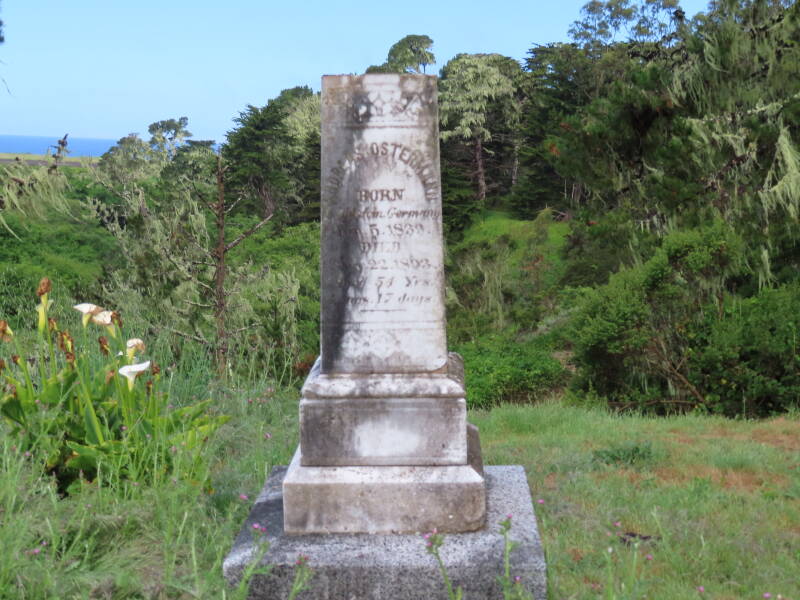 The Purissima Cemetery is essentially all that remains of the town of Purissima. In the 1860s and 1870s, it experienced its heyday as it had a post office, lumber mill, schoolhouse, hotel, saloon, dance hall, livery stable, and several stores. A variety of misfortunes and broken dreams befell the town – a flood, crop failures, and an oil discovery that failed to lead to a boom amongst them. Purissima’s somewhat remote location, and competition from more favorably located coastal towns, didn’t help. By World War II it was largely just a memory. The cemetery, a natural burial ground, consists of graves scattered around cedar and pine trees on slightly hilly terrain. Many of the graves are of the German pioneers who settled there, while the modern ones draw attention with the addition of flowers, shells, and other colorful supplements.