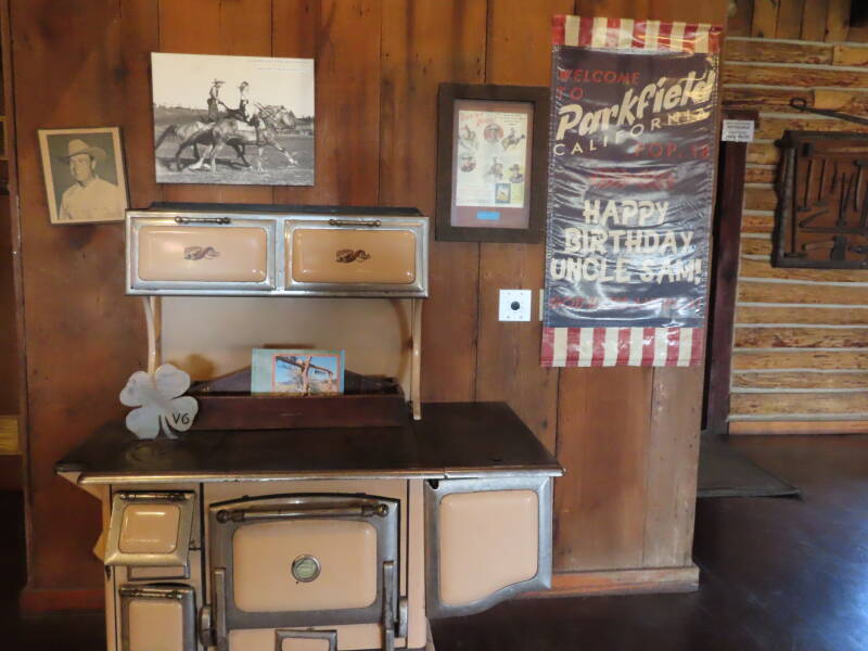 The dining room features saddles for barstools and has cattle ranching paraphernalia hanging from the ceiling. The lobby sells plush steers and cowboys, cowboy-themed mugs and air fresheners, a jigsaw puzzle depicting a cattle drive, and other items. A bumper sticker features a cowboy banging a frying pan with a wooden spoon, calling out the town’s slogan “Be here when it happens.”