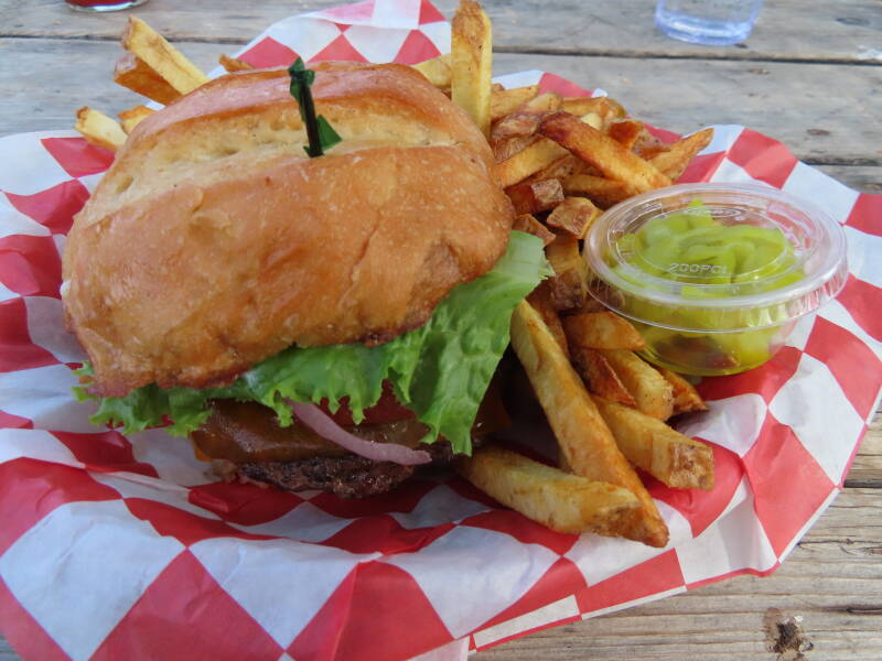 The web promises a great burger at the Parkfield Cafe. I try the bacon cheddar burger, and it explodes with the taste of those key ingredients, with a patty that oozes juices, a crunchy bun, and the taste of having been cooked over an open oak barbecue pit. This early autumn day there is a light, warm breeze, woodpeckers and other birds, and the murmuring of six motorcyclists at a neighboring table. Add the burbling of the water fountain, the fresh green lawn my wooden picnic table sits on under the shade of tall oaks, and the country music playing unobtrusively over the loudspeaker, and for thirty minutes there is no pandemic. Life is sweet.