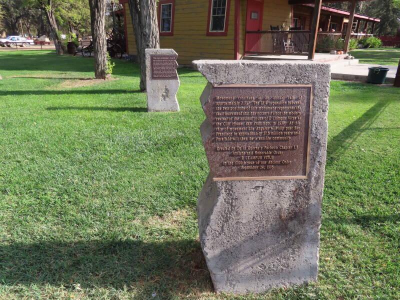 A monument in the park bears witness to the theory of plate tectonics. Two concrete slabs, placed some 12 feet apart, show how much the ground has moved since 1931. About 31 million years from now, Los Angeles will slip past San Francisco, and Parkfield will be undersea.