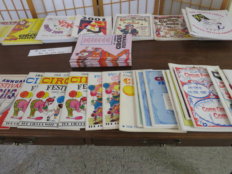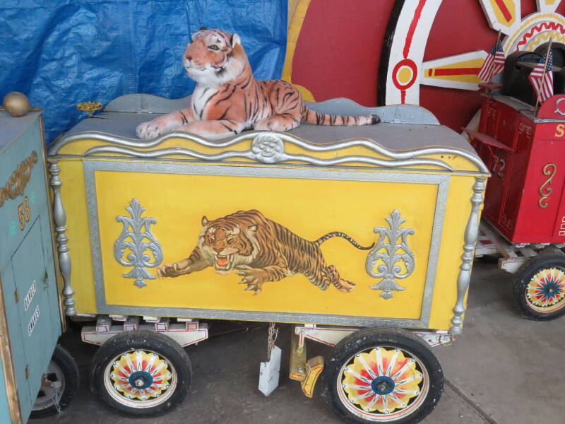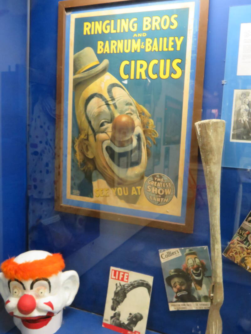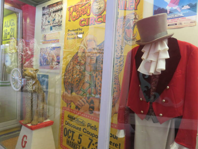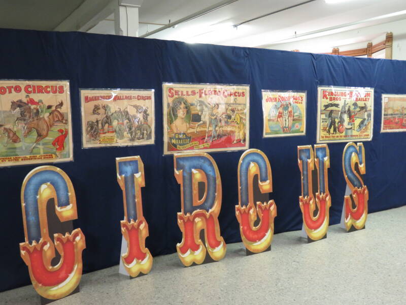 The International Circus Hall of Fame, or ICHOF, came from Sarasota, Florida, in the 1980s. It is situated in a large warehouse in the middle of farmland. I pull up to a trailer home which serves as the office. The lady there leads me to the warehouse, where I am the only visitor for the next couple of hours. While not a formally designed museum by any stretch, the ICHOF does get the information across. The signs and artifacts are displayed on panels and walls filling up the warehouse. The center of the building, as well as areas outside of it, shows circus train cars and wagons.